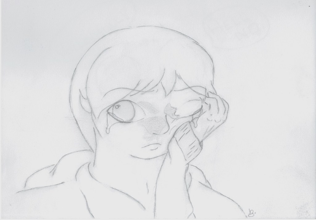 Kuro jumped at hearing someone address him. Blood and water flowed down his chin where it fell to the heavily stained sweater. A bruise already showed across his cheek up to his eye and over his nose. The fear in his eyes was enough to break Emmett’s heart. “I-I tripped.”