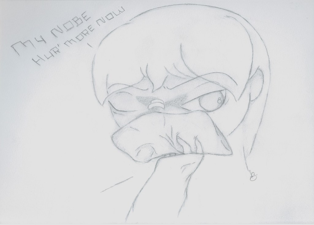 Carefully he placed the icepack to his nose. There was a bandage on it now, “can’ bewieve you made me go a do’tor.”