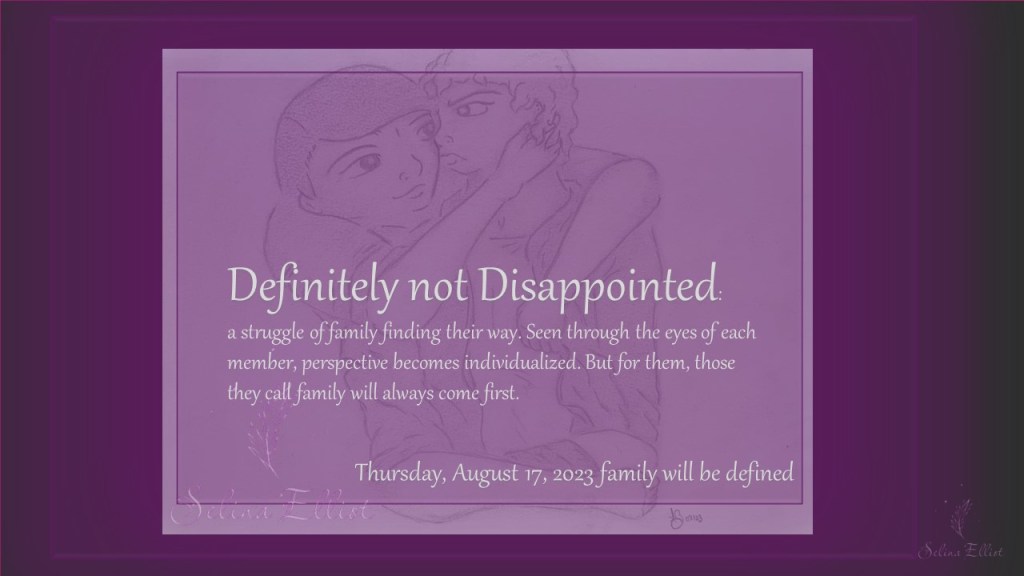 In the next few weeks I’m going to introduce you to the characters of Definitely not Disappointed. The original artwork, slightly hidden behind the purple filter, will be revealed when the story goes live on Thursday, August 17, 2023.
