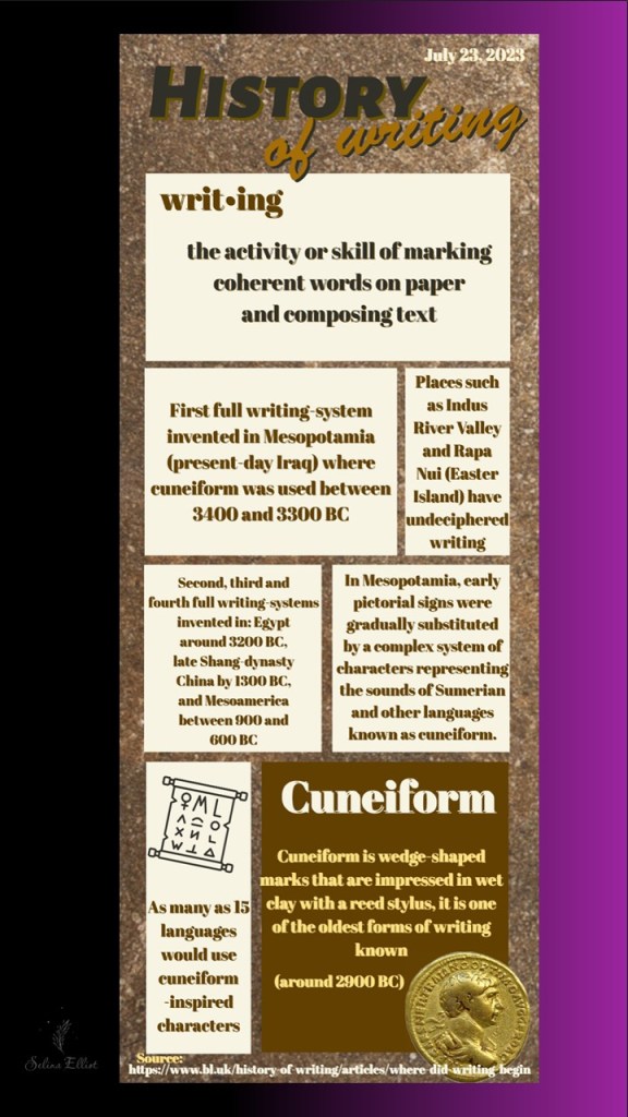 But I don’t know the future. All I can do is continue to move forward. In honor of all the artists and authors, my sister created an infographic of the History of Writing! It’s fascinating to see where writing began. I feel strongly that as a community, our hearts will never be silenced for the sake of productivity or profit.