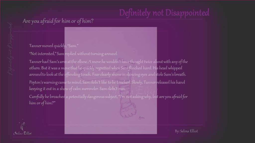 Tanner had Sam’s arm at the elbow. A move he wouldn’t have thought twice about with any of the others. But it was a move that he quickly regretted when Sam flinched hard. His head whipped around to look at the offending touch. Fear clearly shone in dancing eyes and stole Sam’s breath.