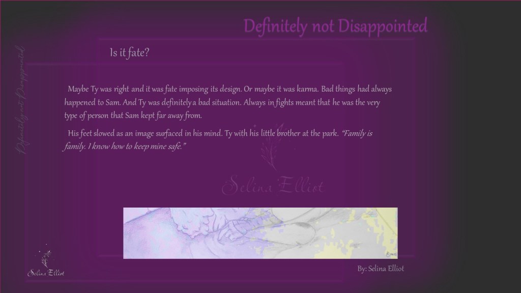 A bitter smile surfaced! Maybe Ty was right and it was fate imposing its design. Or maybe it was karma. Bad things had always happened to Sam. And Ty was definitely a bad situation. Always in fights meant that he was the very type of person that Sam kept far away from.