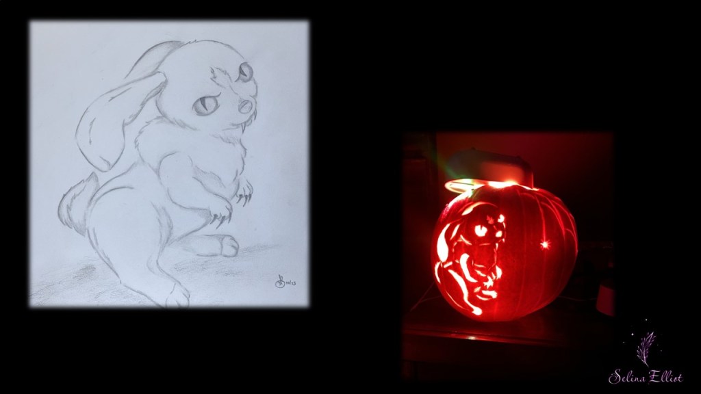But when the gift means that I get to carve my own sketch, then I think I’m the ultimate winner here! Thanks goes to my friend Kyra who wanted a carved pumpkin but didn’t have the time to do one up. Now my lonely pumpkin has a purpose and I got to sketch the cutest evil bunny.